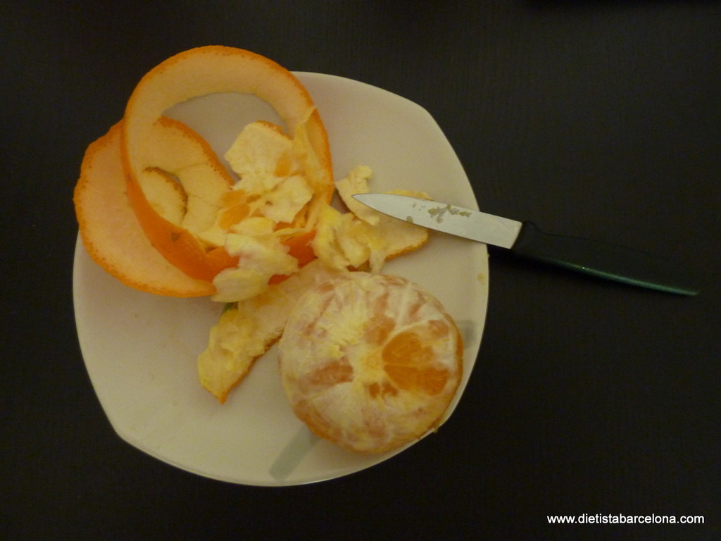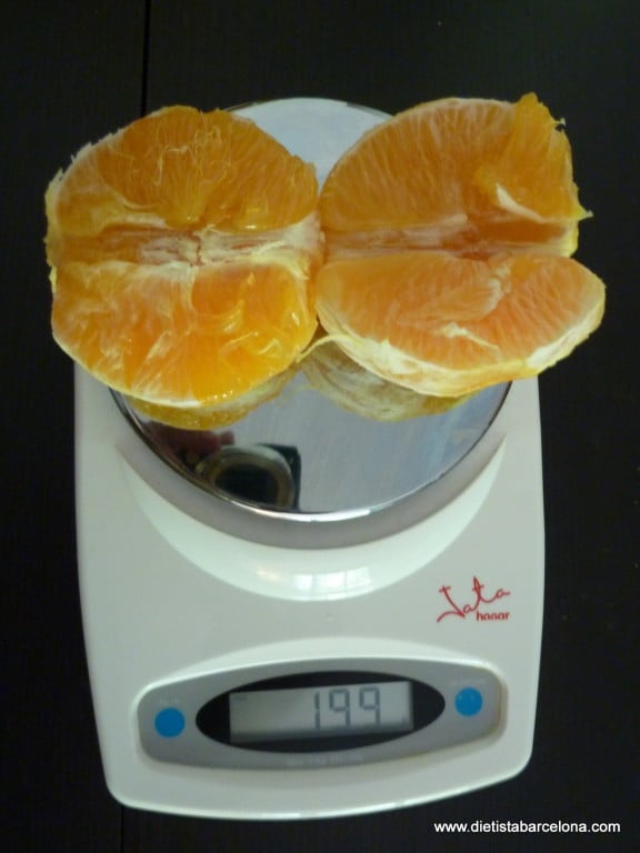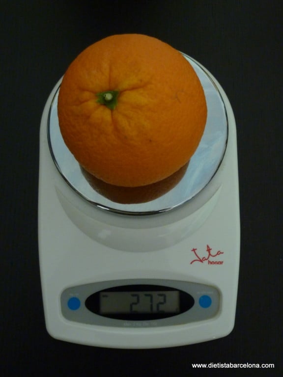 Como podéis comprobar, una naranja mediana pelada, pesa aproximadamente unos 200 gr así que media naranja son 100 gr.